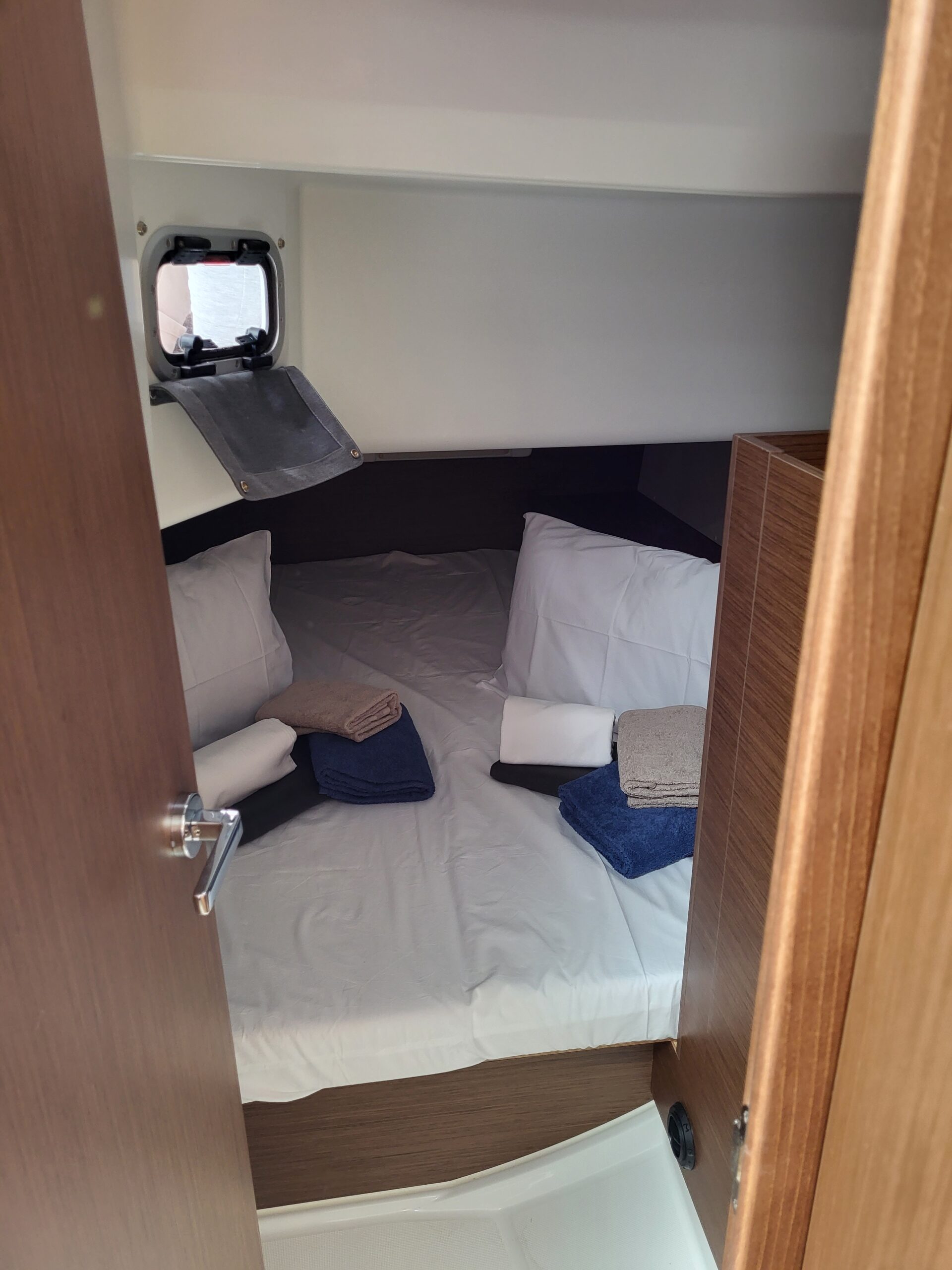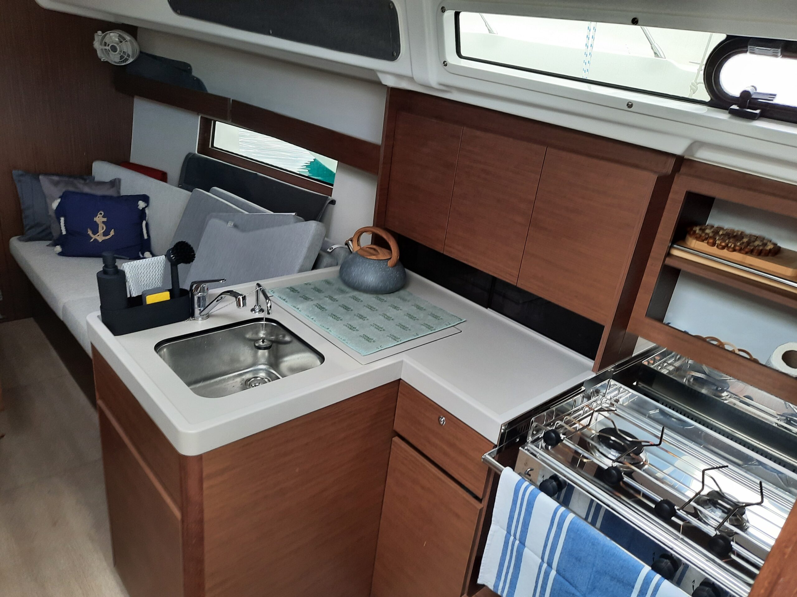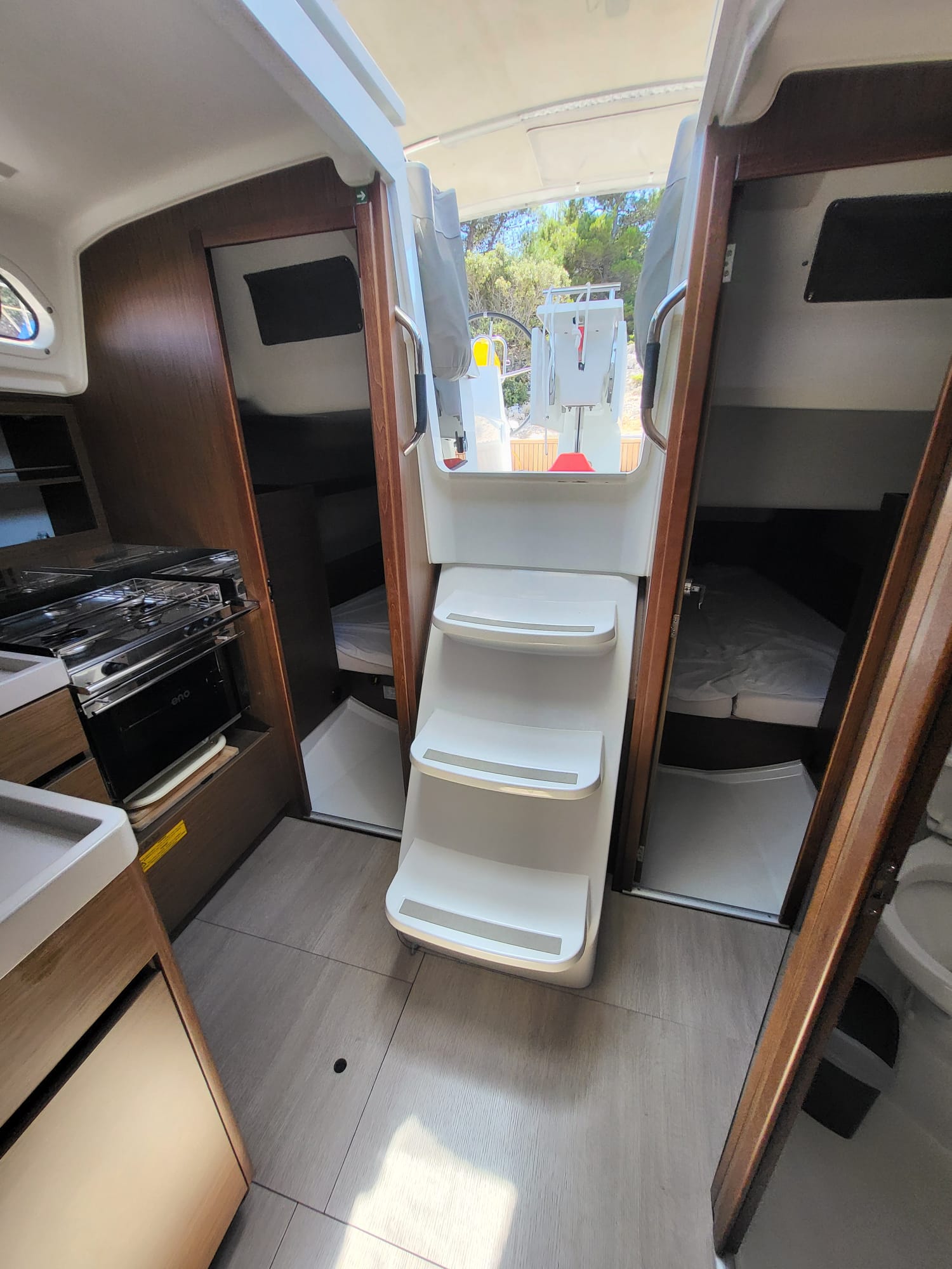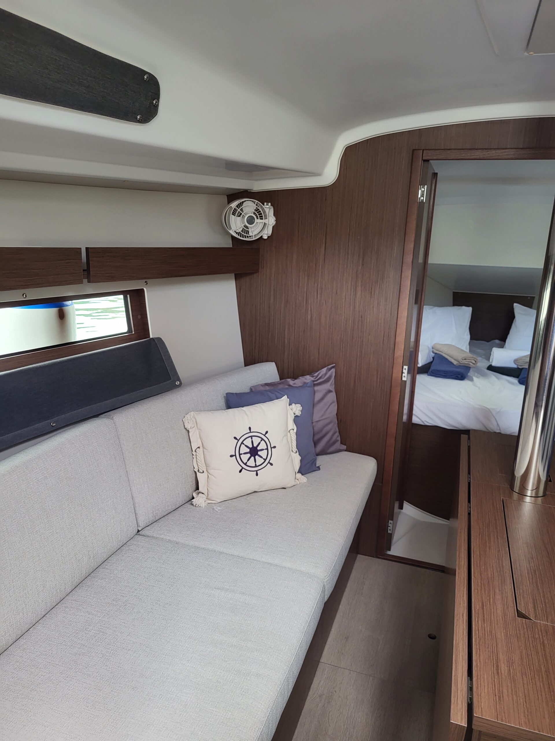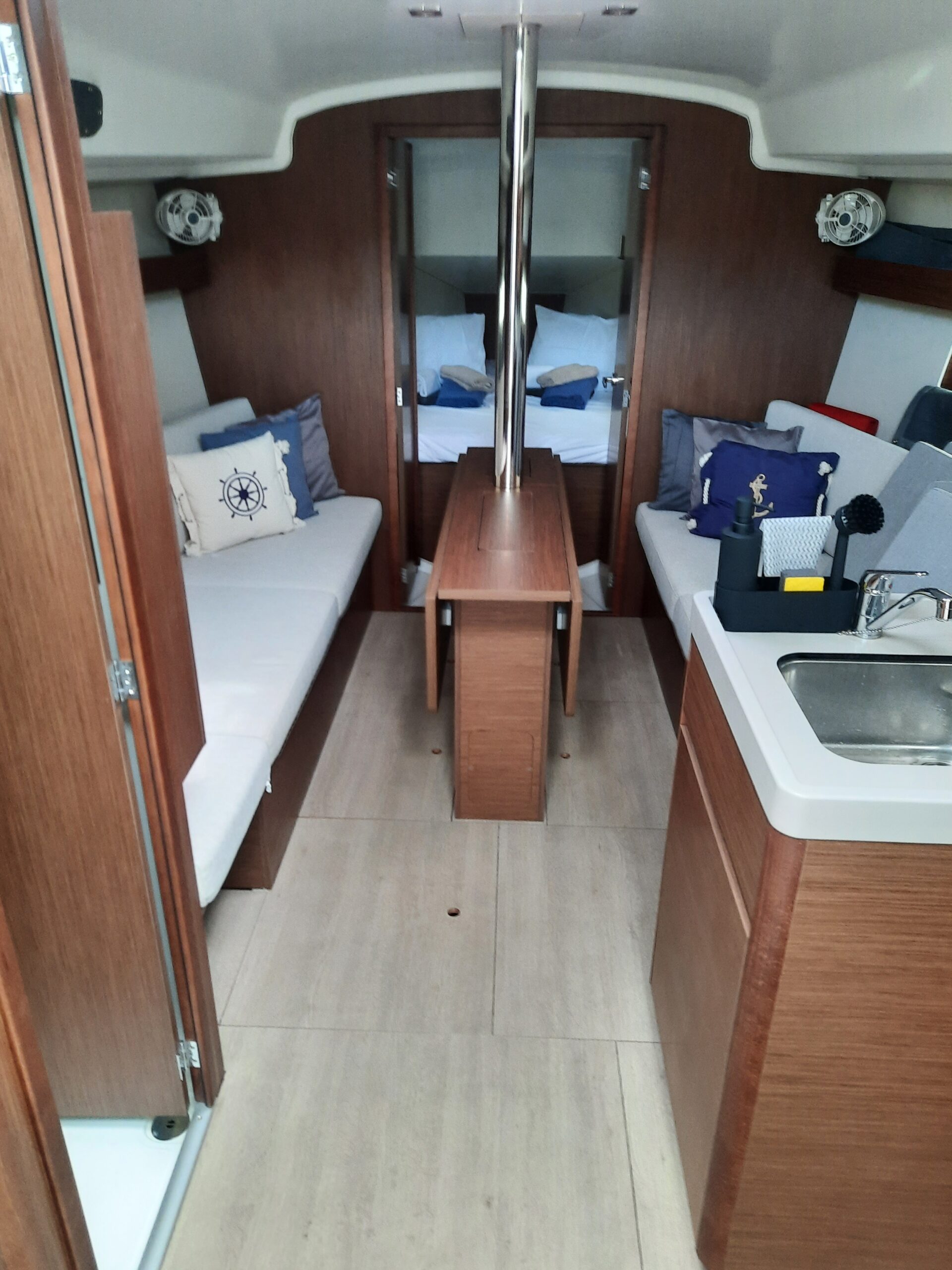 Unutra, brod ima tri dvokrevetne kabine, salon, toaletni prostor i kuhinju. Brod ima četiri otvora na palubi, četiri otvora na trupu i duge prozore u kabinama tako da se u potpunosti možete prepustiti užicima jedrenja i vidicima što vam ga pruža prostrana unutrašnjost.